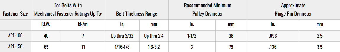 - Fastener Strength: Rated from 40 to 65 PIW (7 to 11 kN/m) for reliable performance in light to medium-duty belt applications.