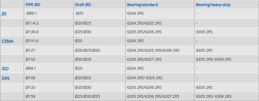 - Customizable Sizes: Available with pipe diameters Ø89.1 mm to Ø159 mm and shaft diameters Ø20 mm to Ø35 mm, adaptable to various conveyor designs.