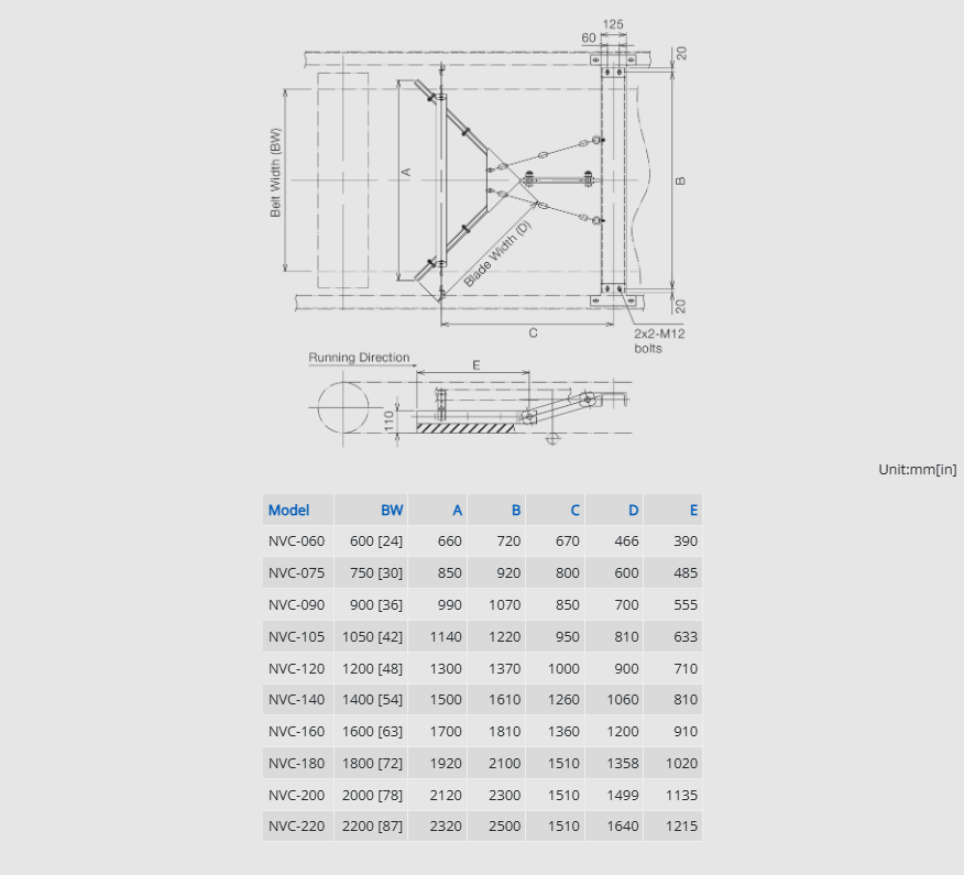 The V-Plow Belt Cleaner supports belt widths from 600 to 2000 mm, belt speeds up to 6.5 m/s, and is designed for one-direction cleaning with a durable polyurethane blade.