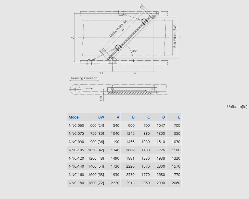 The Diagonal Plow Belt Cleaner is suitable for reversible conveyors with belt widths from 600 to 2000 mm and belt speeds up to 6.5 m/s. It uses a polyurethane (PU) blade to provide smooth, safe, and effective cleaning in both directions.